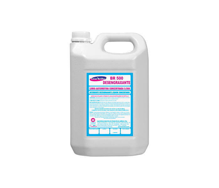 Finalidade: Desengraxante Concentrado BR 500 é um detergente alcalino desenvolvido para a remoção de sujeiras pesadas em chassis de veículos, motores, pneus, carrocerias de madeira, tratores e implementos agrícolas. Também pode ser utilizado para remoção de graxas e óleos em pisos e paredes. Não se recomenda o uso em superfícies pintadas.